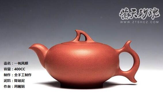 周丽娟紫砂壶作品——一帆风顺 手捧一把暖心贴肺的紫砂壶,浑身上下的敦厚内敛、古雅蕴藉,把一颗心鹜八极的心绪收敛回来。紫砂器的构造拥有自由和灵性,可以暖手温心,可以成全一种委托生命想象的大美,于是品呷香茗、把玩砂壶渐渐成为的文人们的爱宠,人生感情寄寓其中,枕石醉陶已经足矣。若果既能诗书立世,双能游戏人生,在一把紫砂壶上寻找入世与出世的平衡点,那岂不妙塔哉!